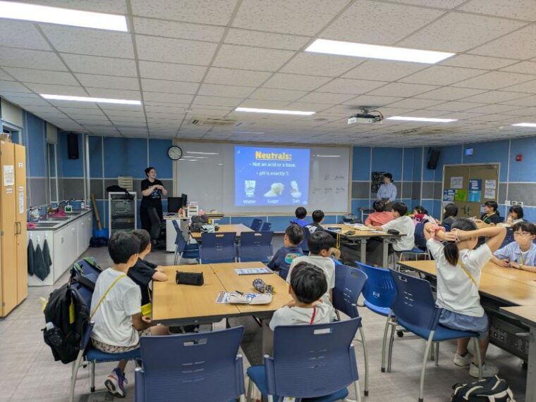 科学の授業です。酸性、中性、アルカリ性について学び、水やお酢はどれに当てはまるか等、まずは英語で学びます。