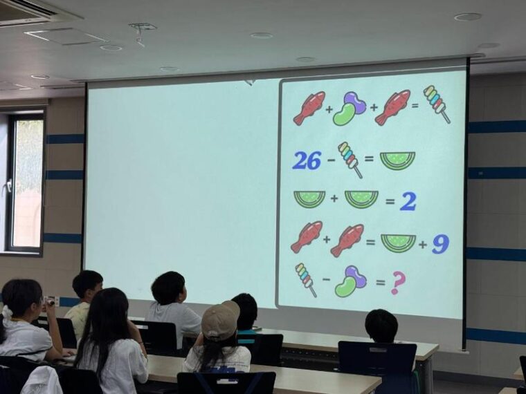一通りストレッチが終わったら、今度は脳トレです。絵文字を数字に当てはめて、?の数字の答えを当てますが、皆さん分かりますか~?