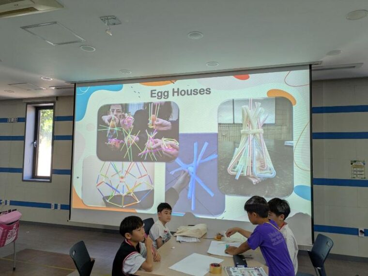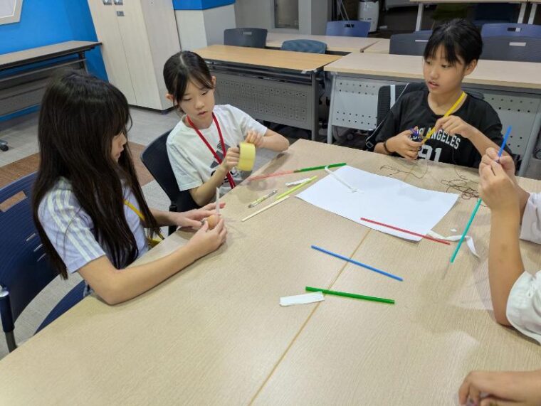 ストローや割りばしを使ってEgg Housesを作り、真ん中に生卵を入れてパラシュートを作ります。