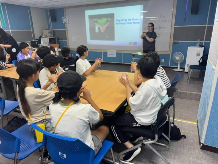 耳で聞いた音を「♪」で表現して、その音が何かを当てるクイズや、手・プラスチックのコップ・体を使って音楽に合わせてリズムを取るゲームを楽しみました。