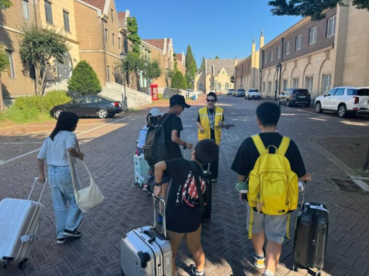 到着したらヘッドティーチャーが出迎えてくれましたよ。さっそく英語でコミュニケーションを取っている子どもたちもいました。スーツケースをもってオリエンテーションの会場へ向かいます。
