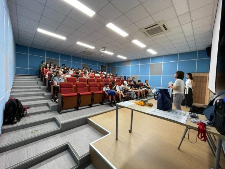 子どもたちにオリエンテーションを実施しています。1日スケジュール、クラスでの注意事項、寮での注意事項を案内しますが、ここでとても大事なお話を子どもたちにさせていただきました。このキャンプは授業から生活まで日本人と韓国人の子どもたちで過ごしてもらいますが、多様性や異文化理解について異なる価値観や考え方を受け入れることは国際化していく日本でもとても重要であること、異なる考えに触れて多角的に物事を考えることも学んでいただきたいという思いでオリエンテーションでも触れさせていただきました。英語以外にも多くのことを学べるキャンプですので、6日間で大きく成長できるように私たちも子どもたちに接していきたいと思います。