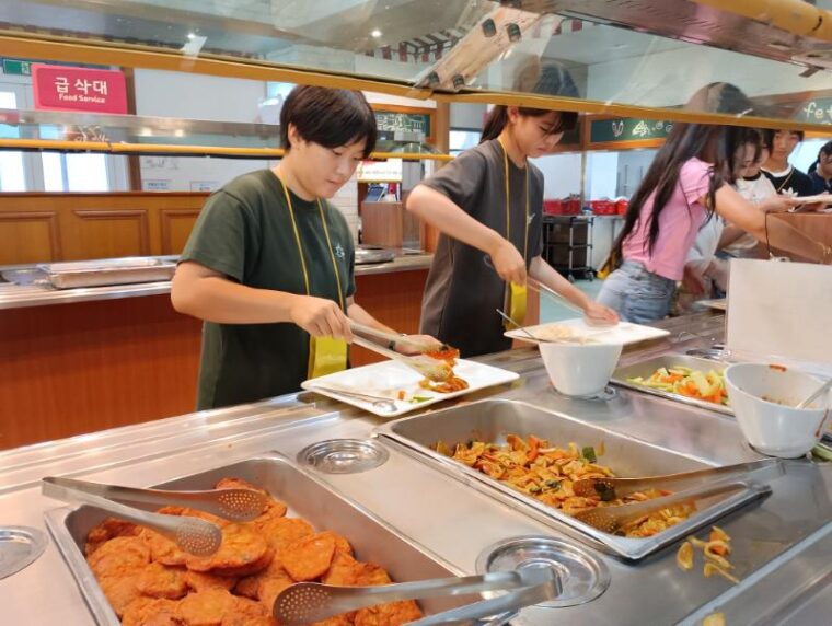 それから学生寮にチェックインします。すでに韓国人のお友達は到着していたので、Hello, Nice to meet youと言いながら寮の中へ。各自部屋にスーツケースを置いたらすぐに夕食です。