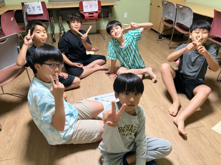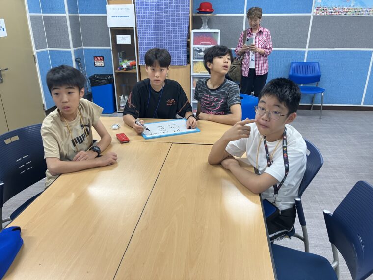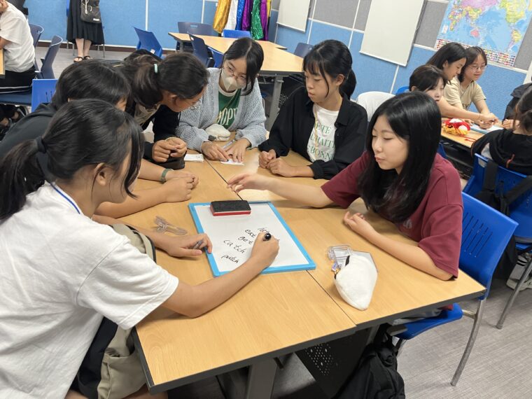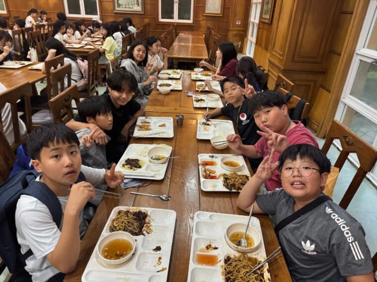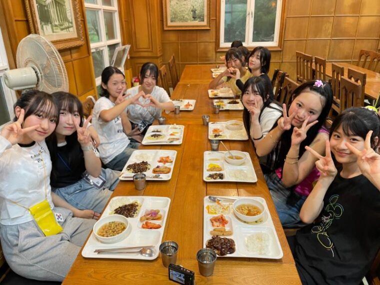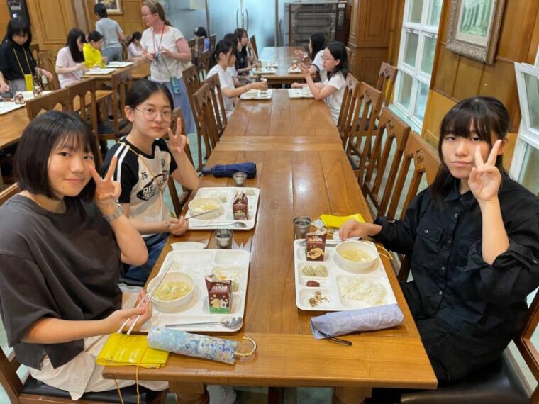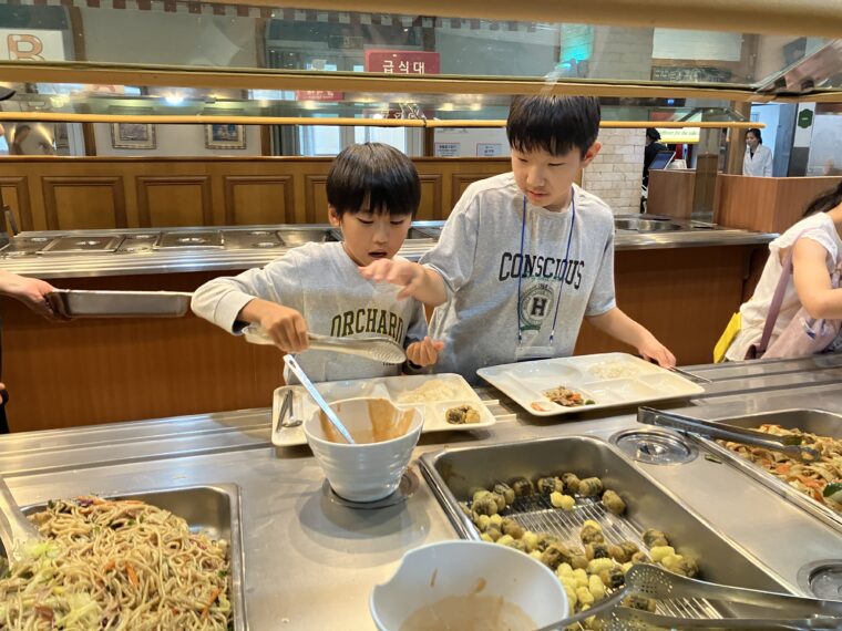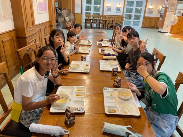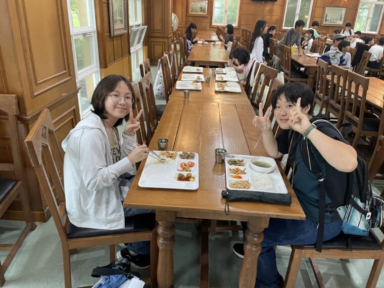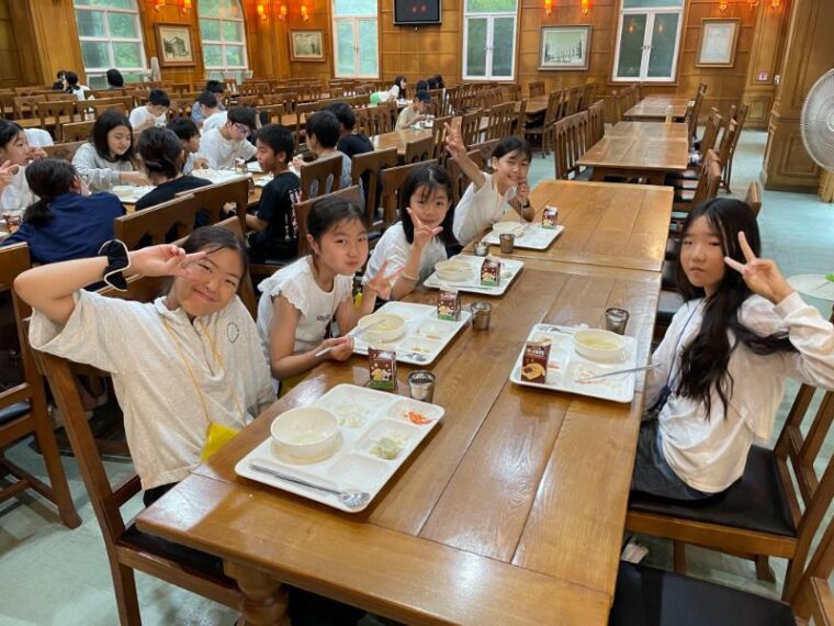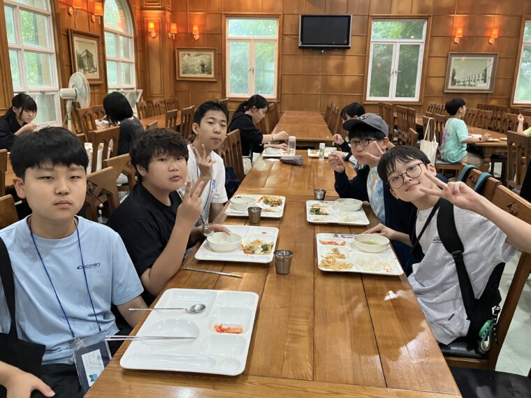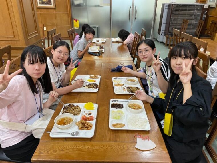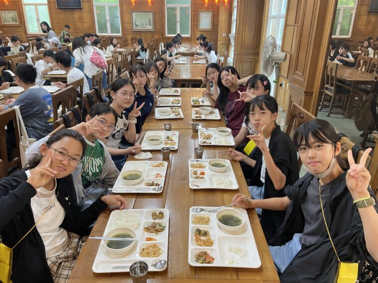 そして昼食です。午後からは5コマ授業が盛り込まれているのでしっかり食べて備えましょう。もうすっかり授業外で韓国人のお友達と一緒にいる風景は珍しくなくなりました。韓国語を教えてもらっている子どもも多いです。オリエンテーションの時にお話させてもらった異文化理解が進んでいて、私たち引率者もとても誇らしい気持ちになりました。