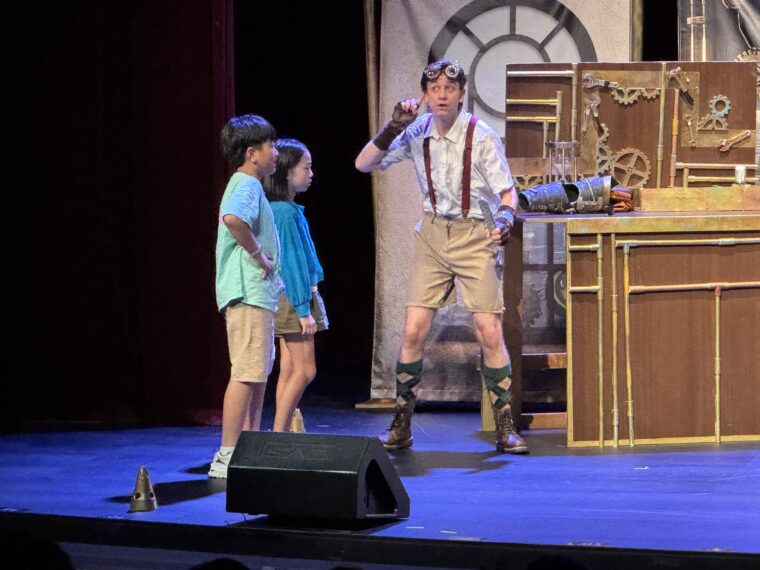 そしてパジュ英語村のメインイベントであるミュージカルです。パジュ英語村では舞台や歌、ダンスなどを専門に活動するEdu-tainer(Education+Entertainerの造語)たちがオリジナルの作品を上演しています。今日の演目はSchool for Monstersです。ストーリーはモンスターの学校に人間が潜り込んでいるのですが、その人間はモンスターになりたいと願っていました。そのためモンスターになるための機械を製作するのですが、その機械の中にはSTRONG,SNEAKY,SCARYの3つが必要なので、子どもたちに手伝ってもらって、その3つを集めるために奔走します。ハプニングで人間以外の人がその機械にはいってしまいますが何とか救い出すことができて、モンスターたちの信用を勝ち取り、人間もモンスターの学校に通えるようになりました。子どもたちの参加型のミュージカルなのでボランティアを募るとみんな必死に手を挙げてアピールしたり、リズムに乗って手をうったり楽しんでいました。