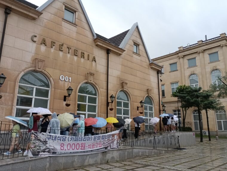 傘やカッパを着た子どもたちが今日も朝食をとりにカフェテリアへ向かっています。