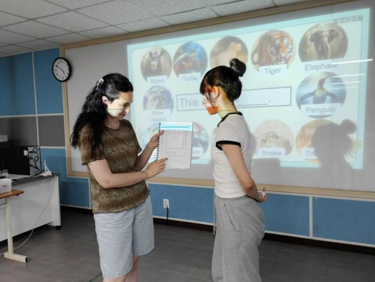 子どもたちの興味を引くように絶滅危惧種を題材にし、グループでクイズに答えたり、ワークシートをグループで協力しながら埋めながら、英単語や文法を楽しく学んでいます。高学年のクラスでは絶滅危惧種をピックアップして、ミニプレゼンをしていました。
